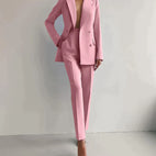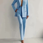 Discover the Marva blazer and pants suit – an elegant women's suit available in trendy colors such as light blue, black, pink, and turquoise. The modern blazer tailored to the pants showcases a silhouette-enhancing line and meticulous craftsmanship with stretch fabric that ensures all-day comfort. This timeless suit is ideal for the office, meetings, and special occasions, and suits both business looks and sophisticated casual outfits.
