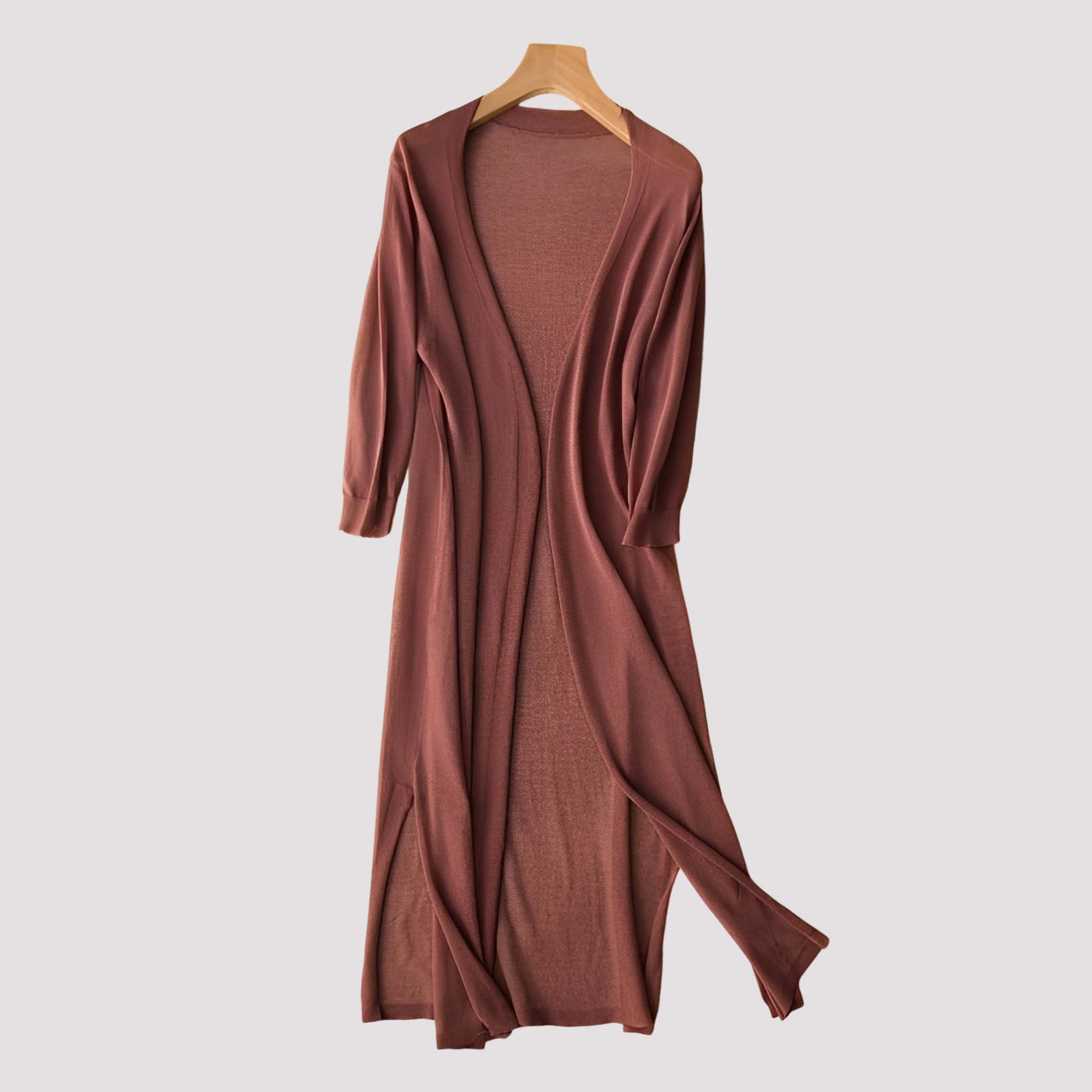 Długi kardigan „Fannie” to doskonałe uzupełnienie dla swobodnych i stylowych strojów. Dzięki luźnemu krojowi i przyjemnej długości zapewnia zarówno ciepło, jak i swobodę ruchów. Niezależnie od tego, czy nosisz go do dżinsów, legginsów czy sukienek – ten kardigan można wszechstronnie łączyć. Miękki materiał zapewnia przyjemne uczucie noszenia przez cały dzień. Idealny na chłodne dni lub przytulne wieczory.