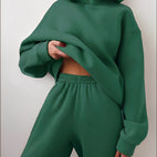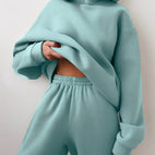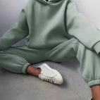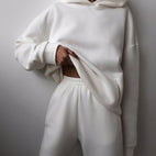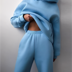 Komplet Jasmine to bluza z kapturem o swobodnym kroju i pasujące spodnie dresowe, które zapewniają wygodę i lekkość ruchu. Delikatne materiały zapewniają komfort noszenia, a nowoczesny design czyni go uniwersalnym strojem na wolne chwile. Doskonały do pracy w domu, spacerów lub odpoczynku na świeżym powietrzu.