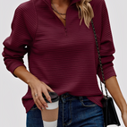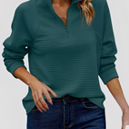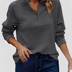 Sweter Katheryn ma swobodny fason i półzamek przy dekolcie V, co pozwala na łatwe dostosowanie kołnierza. Materiał jest miękki i przyjazny dla skóry, dzięki czemu sweter świetnie sprawdza się na co dzień, do pracy czy na wyjścia. Jego luźny krój dodaje każdej stylizacji swobodnego, nowoczesnego wyglądu, a solidne wykonanie zapewnia trwałość i wygodę. To wszechstronny element garderoby, łączący modę z komfortem.