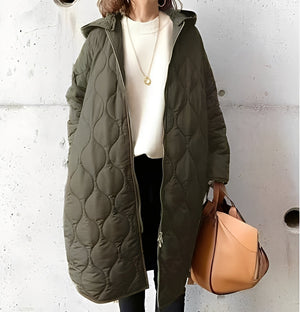 Krystine – Nowoczesna luźna parka z kapturem to świetny wybór na zimne dni. Jej miękki materiał zapewnia przyjemne ciepło, a praktyczny kaptur dodatkową ochronę przed wiatrem i niepogodą. Nowoczesny wzór Argyle nadaje parkace modny wygląd, który łatwo połączyć z innymi rzeczami. Niezależnie, czy na co dzień, na spacerze, czy na czas wolny – ta parka oferuje praktyczność i modny styl.