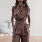 Elegancki bezrękawowy kombinezon z wysokim paskiem