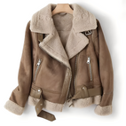 Kurtka „Yasmine” łączy styl motocyklowy z przytulnym ciepłem. Wykonana z miękkiego zamszu na zewnątrz i ocieplona owczą skórą wewnątrz, oferuje styl i wygodę na chłodne dni. Wyrazisty kołnierz rewersowy i motocyklowe akcenty dodają jej nowoczesności. Idealna dla kobiet szukających ciepłego, solidnego i modnego towarzysza.